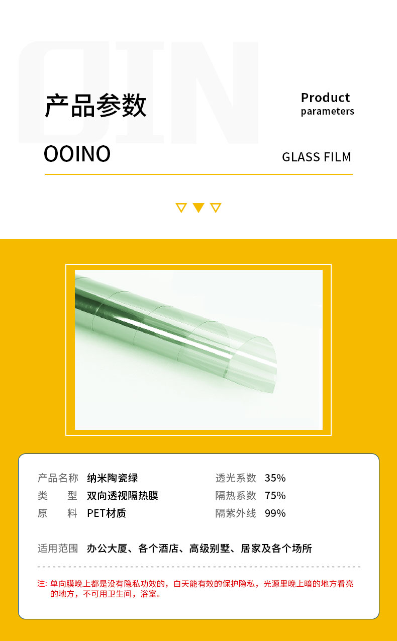 反射及阻斷了大部分太陽熱能、紅外線、有害紫外線、刺目眩光等,使室內光線變得柔和舒適,溫度平衡。太陽熱是通過光輻射到地面的,其中隔紫外線99%、隔熱系數約75%,透光約35%,隔熱膜通過反射及阻隔太陽光中的各種熱源以達到隔熱的效果。