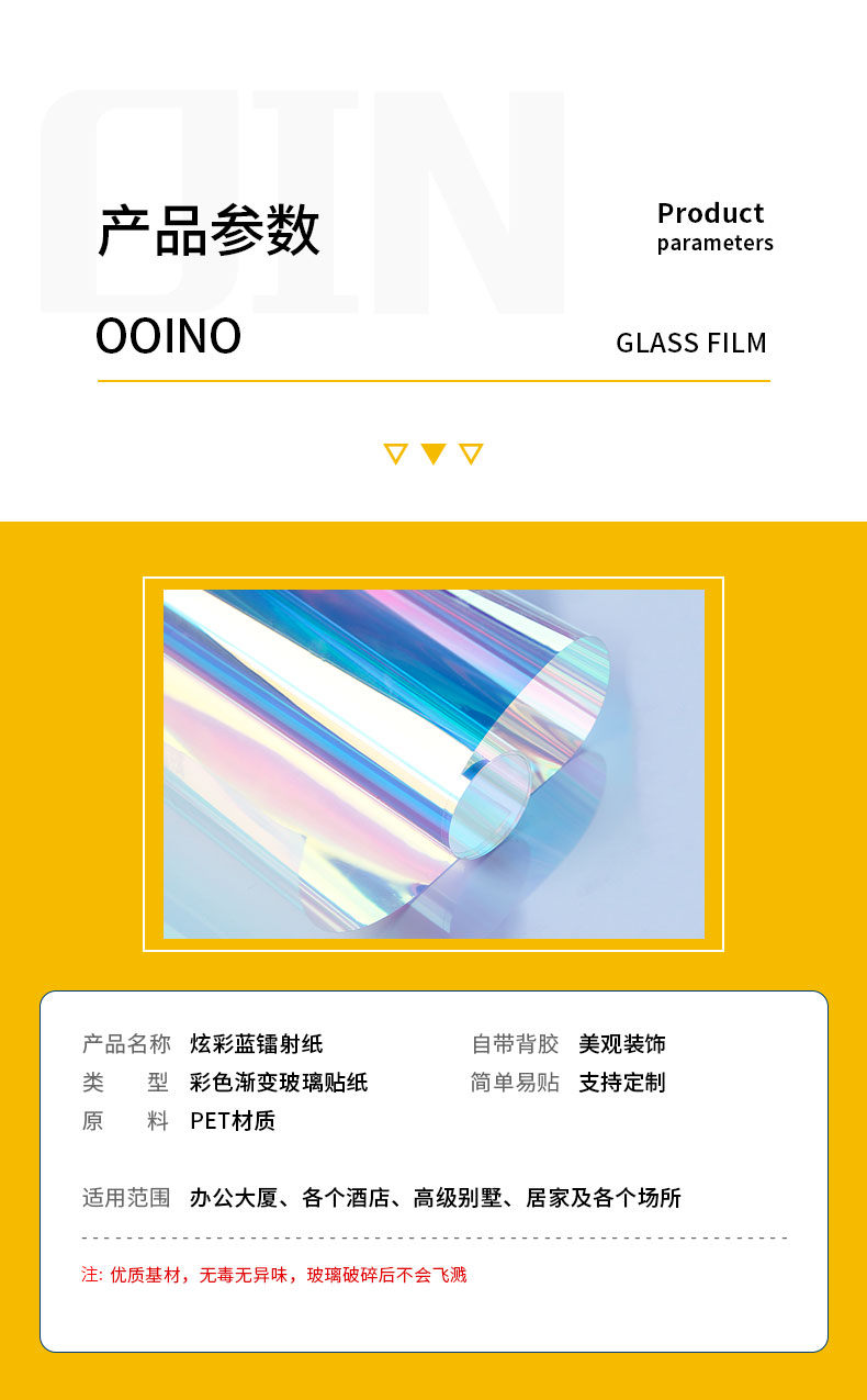 炫彩膜是一種神奇會變色的玻璃膜,在不同角度和不同光線下可以呈現出不同的色彩看上去較為夢幻多彩。炫彩膜也稱七彩膜、幻彩膜、鐳射彩虹膜等