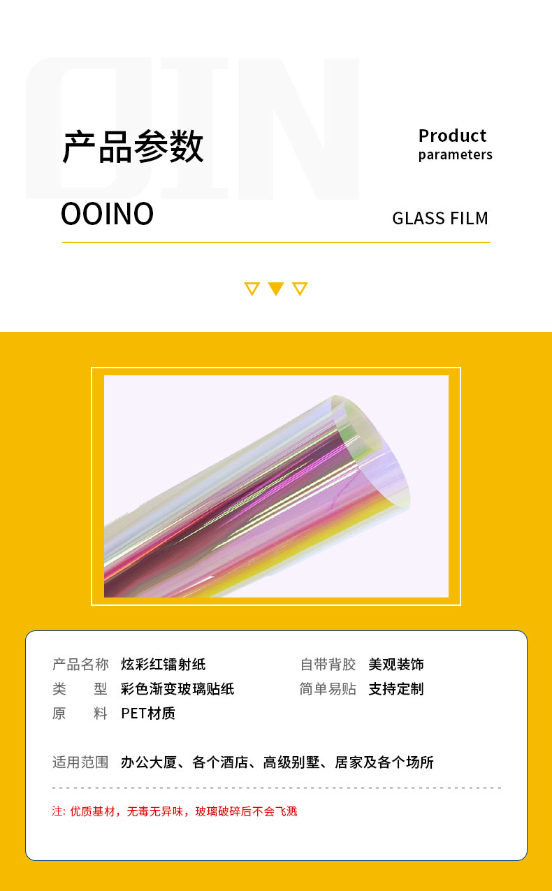 炫彩膜是一種神奇會變色的玻璃膜,在不同角度和不同光線下可以呈現出不同的色彩看上去較為夢幻多彩。炫彩膜也稱七彩膜、幻彩膜、鐳射彩虹膜等